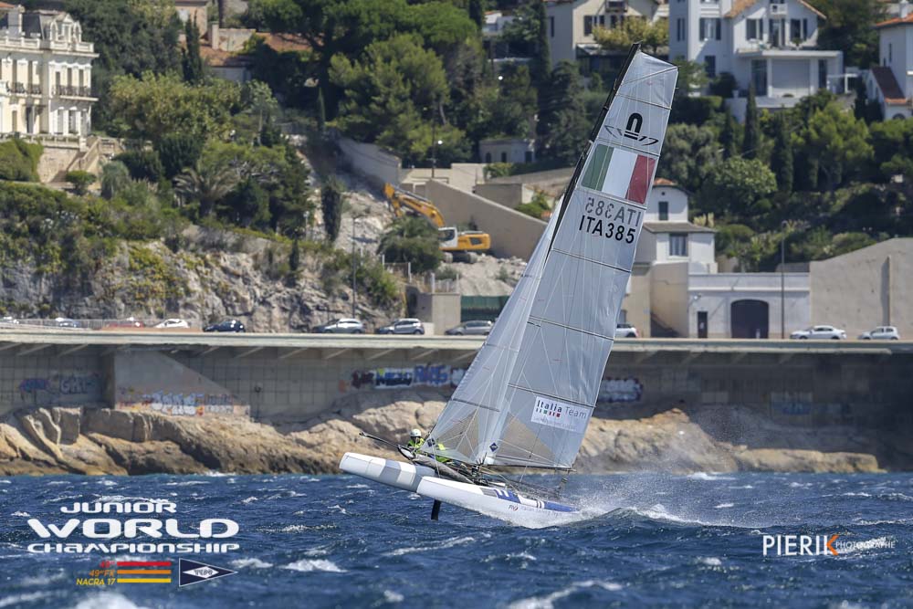 Gianluigi Ugolini & Maria Giubilei (ITA) just won the 2018 Junior World Championship for the Nacra 17! They won the only race today, ultimately winning 6 of the 7 races that were run for the Nacra 17 and were clearly the class of the field. Upwind the racing was typically quite close, but the Italians had a read edge downwind, and the only race they didn’t win was the first super windy race of the regatta.