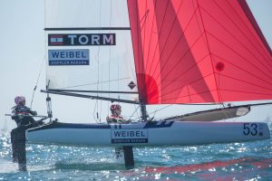 Fifth in Kiel, Gimson, added, “We picked up our boat the day before the Europeans and then built it the day before and then raced. But we had spent a lot of time in Bermuda with Artemis sailing the foiling Nacra 20s. It was just about converting that to the platform we have now.” “Some guys are making the upwind foiling work, Ben (Saxton and Katie Dabson) are making that work reasonably, the Kiwis have a nice mode as have the Italians but you need a lot of space to do that. It is OK on tuning runs but on the race course it is a different story.”
