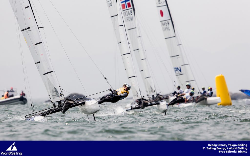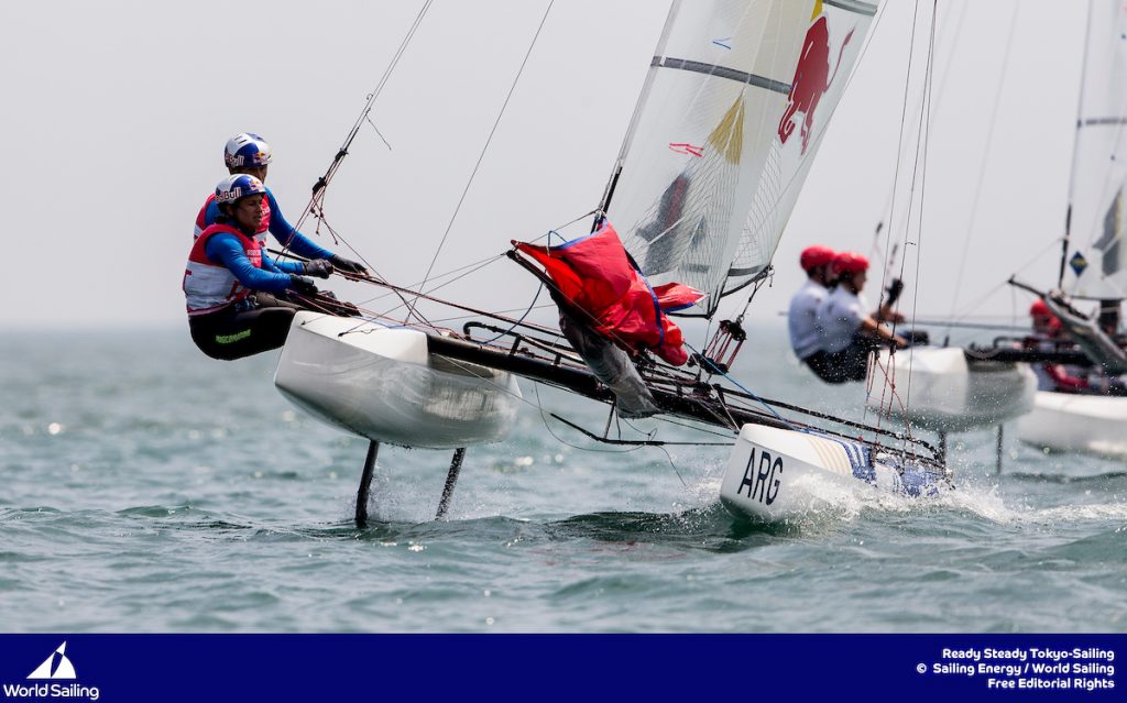 Racing on the Tokyo Olympic medal race course in Enoshima Japan, the Argentinian team of Santiago Lange & Cecilia Carranza Saroli, who captured the hearts of the world in Rio three years ago, could be on track for an epic repeat just one year out from the Tokyo 2020 games. Lange & Saroli were dynamic in the light and shifty conditions, sailing a tactically solid first two races and recovering from a deep top mark rounding to finish fourth in the third race of the day.