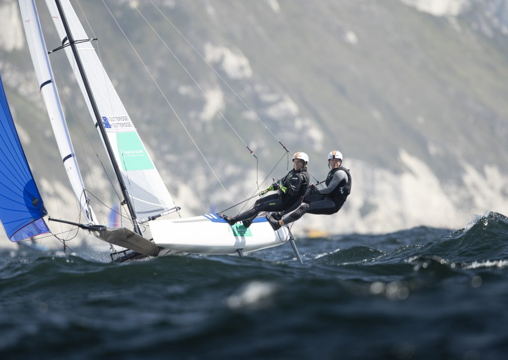 It was a pretty impressive day for the Phillips brothers from Australia, particularly in the first three races with scores of 1,2,1 before a less memorable 15th in the last race of the afternoon. “Nice to be back in Weymouth,” said Sam, crewing for brother Will. “You don’t miss many days sailing in Weymouth, it’s nearly always good here.” The Phillips missed most of the 2018 season after Sam broke his foot in a bone-crunching nose-dive at 35 knots in the now-defunct SuperFoiler circuit which lit up Australia just over a year ago. The Princess Sofia Trophy in Palma a few weeks ago was their first competitive nacra17 outing together in a year, so to find themselves near the front of this world-class fleet after the first day is a welcome return to form for the brothers.