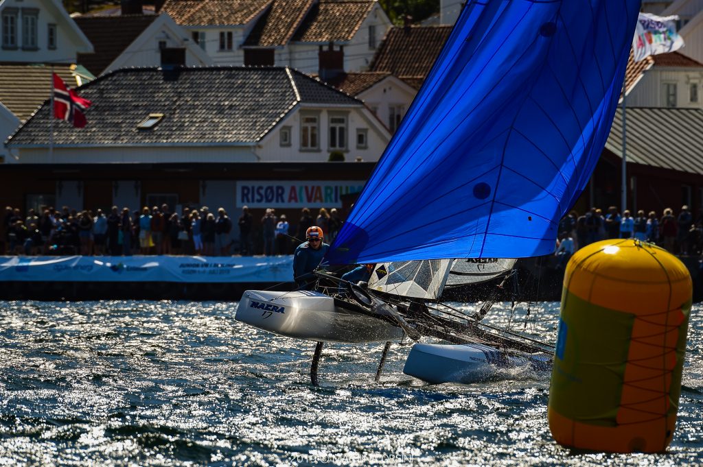 Under perfect conditions the Nacra 17 fleet raced up and down the season front of Risor to a cheering crowd. The leading Italians struggled today, with a capsize and a breakdown, but each time they got rolling again to chase a decent scoreline. In front of a boisterous crowd that numbered over 1000 spectators they […]