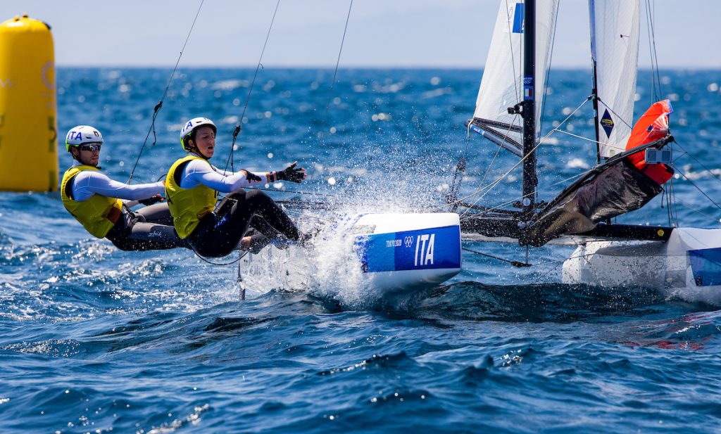 The Italian pair, made of a converted nacra17 helm and a converted laser radial crew have shown they have every tool available to them. Silky smooth boat handling, good starts with plenty of savvy when necessary, good boatspeed on the unwinds, and blinding speed on the downwind, if there is a fault in their sailing game is has yet to be found in Tokyo.