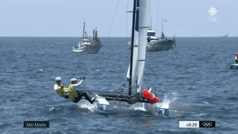 Gimson is 38 years old and is in his first games while Burnett is in her twenties and also in her first games. Gimson has had a 16-year Odessy chasing the games between the Tornado class, Star Class, and now Nacra 17 Class. He’s put in his time and shown his tenacity and love for the sport. Despite missing games selection behind a very tough British Sailing team line-up, they are assured to get a medal so long as they are not disqualified from the medal race.