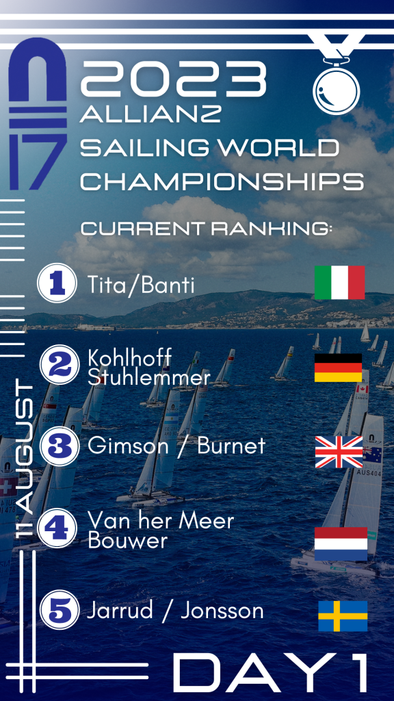 Kohlhoff and Stuhlemmer (GER) picked up a pair of wins today and a 7th place. They added a ‘bonus’ point for not having their paperwork done in time three days ago, as did 10% of the fleet, but sit in second overall.