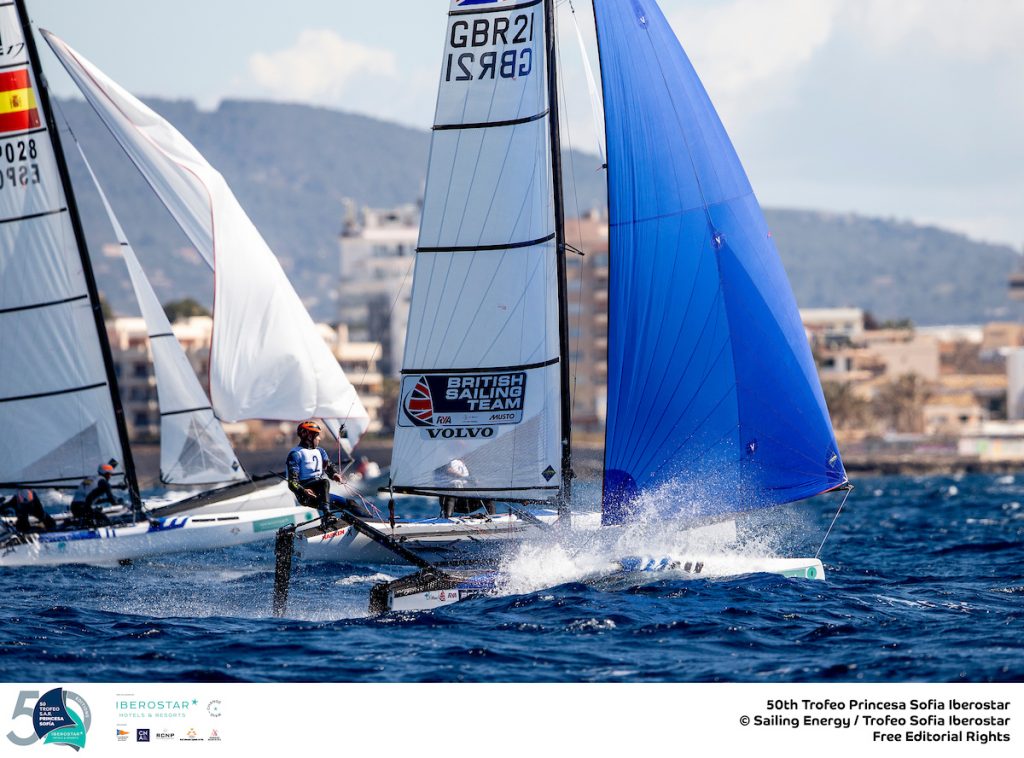The regatta began in very light and tricky conditions, with Germans Paul Kohlhoff & Alica Stuhlemmer, and New Zealanders Gemma Jones & Jason Saunders off to the best starts on day one. Day two saw more typical Palma conditions, with warm sunshine and a moderate seabreeze. Following an 18th and 2nd placing on the opening day, the current World and defending Trofeo Princesa Sofia Champions Ruggero Tita & Caterina Banti (ITA) jumped to the top of the leaderboard after a string of second places.