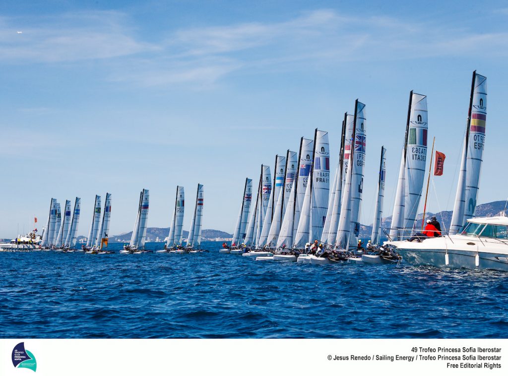 Mallorca, Spain (April 2, 2018) – The light, unsettled breezes on the Bay of Palma presented a really testing opening day at the 49th Trofeo Princesa Sofia Iberostar. With a maximum eight race courses in operation, it was often the case that one Olympic fleet was struggling in next to no breeze while classes on the opposite side of the substantial bay was enjoying good racing in 10 knots of wind.