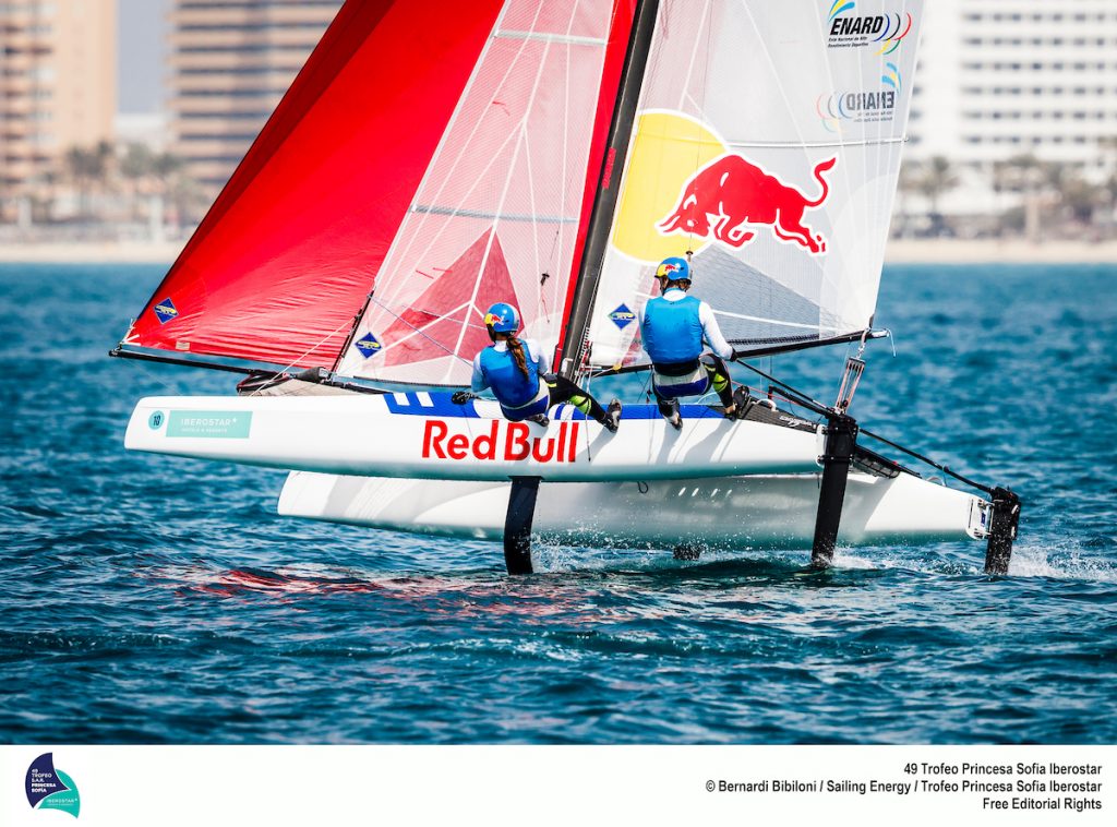 Saxton and Boniface sailed a 1,1,2 to lead the Italian duo by two points. Their tally for the day was matched by Spanish veteran Fernando Echavarri and Tara Pacheco from whom Saxton and Katie Dabson snatched the 2017 world title on the last run of the last race in La Grande Motte last September. Boniface is subbing in for injured Dabson for this regatta.